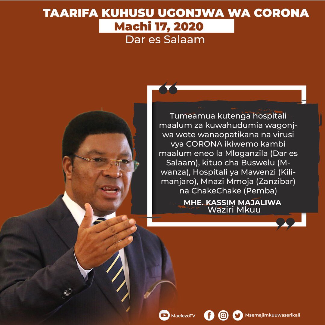 Siku moja baadaye, Waziri Mkuu wa Tanzania, Kassim Majaliwa aliuhakikishia umma kuwa serikali imejipanga kirasilimali, kitaalamu na kimiundombinu kupima na kutoa huduma za kitabibu. Zaidi, akatangaza msimamo wa serikali, wenye udhibiti zaidi, kwamba shule zote zitafungwa kwa siku 30, na wakati huo huo, kupiga marufuku mikusanyiko isiyokuwa ya lazima, kuanzia shughuli za kisiasa, michezo, na mambo ya kijamii. Tamko hili lilifuatiwa siku ifuatayo na la kufunga vyuo vya kati na juu nchini.