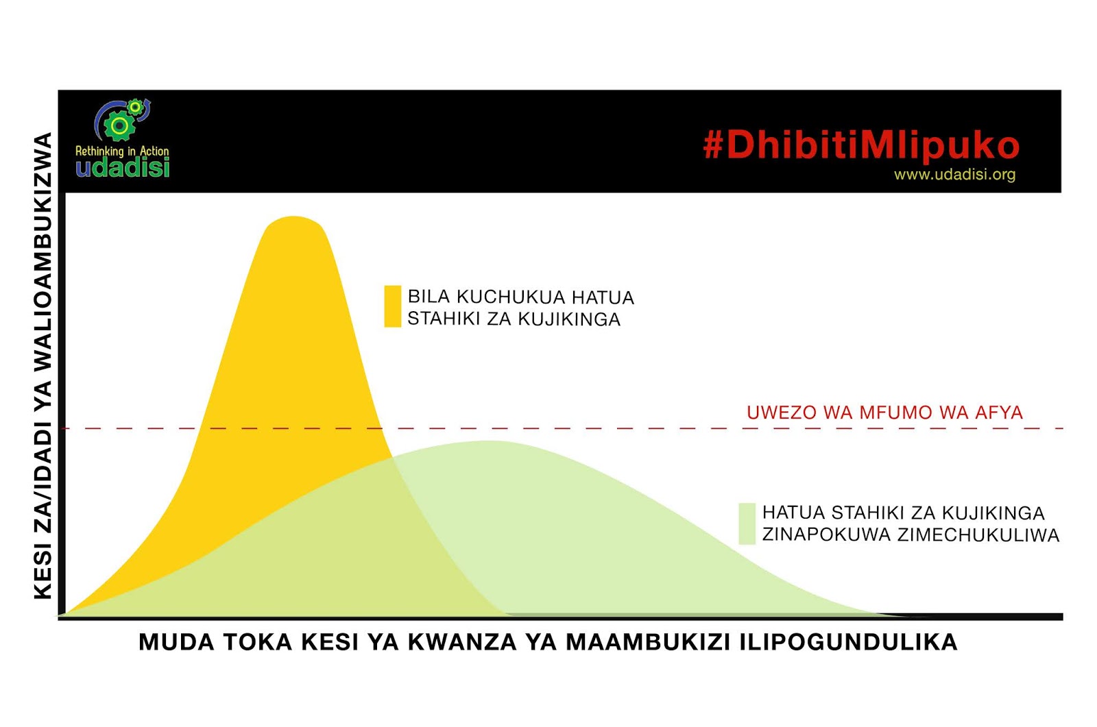 Dhana hii bado haijatafsiriwa kikamilifu kwa kiswahili ila, kwa matumizi ya sasa, tunaweza kuiita kudhibiti mlipuko. Na ili kuielezea kirahisi nitatumia mfano kwa kusawazishaji mlima au tuta. Msingi wa dhana hii ni kupunguza kasi ya usambaaji wa maambukizi ya virusi ili kufanya wanaohitaji huduma ya tiba dhidi ya ugonjwa huu, wakati wowote, wawe wachache. Hii itawezesha hospitali, madaktari na wataalamu mbalimbali, kuwahudumia wagonjwa kwa ukaribu na kuokoa maisha yao. Lakini wagonjwa wanapokuwa wengi, hutengeneza kitu tunachoweza kukiita mlima wa maambukizi kama picha hapo juu mwanzoni inavyoonesha, na hivyo kufanya upatikanaji wa huduma za hospitalini kuwa mgumu.