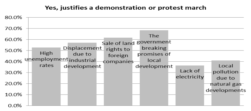 Recent evidence suggests that concerns over “land grabbing”, especially “sale of land rights to foreign companies” played a key role in the outbreak of the 2013 riots in Mtwara (see graph above), and that the southern part of the country – Lindi and Mtwara – has strong sentiments related to land rights issues dating back to Ujamaa days in the 1970s.