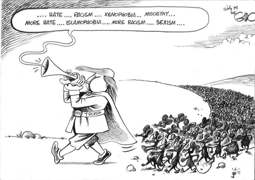 Isemwe pia kwamba kampeni ya Trump imeamsha hisia kali za utaifa wa Kimarekani ambao pia umechangia hisia za kibaguzi dhidi ya “wakuja” au kwa lugha nyingine wahamiaji. Vikundi vidogo vya kibaguzi vinavyojiita vya kizalendo vimepata nguvu kubwa wakati huu, shukrani kwa Trump ambaye amewaahidi “kuwarudishia nchi yao.” Moja ya vikundi hivi ni kile cha “Asimilia Tatu” ambacho kinaamini ni asilimia 3 tu ya Wamarekani wa sasa ndiyo damu yao ilishiriki vita vya ukombozi dhidi ya utawala wa Waingereza. Maana yake hao ndiyo “Wamarekani zaidi.” Wafuasi wa “Asilimia Tatu” wamekuwa wakifanya mazoezi ya kivita kuwa kutumia silaha nzito wakijiandaa kwa lolote ikiwemo kile kilichodaiwa na Trump kwamba kuna njama za yeye kuibiwa kura!