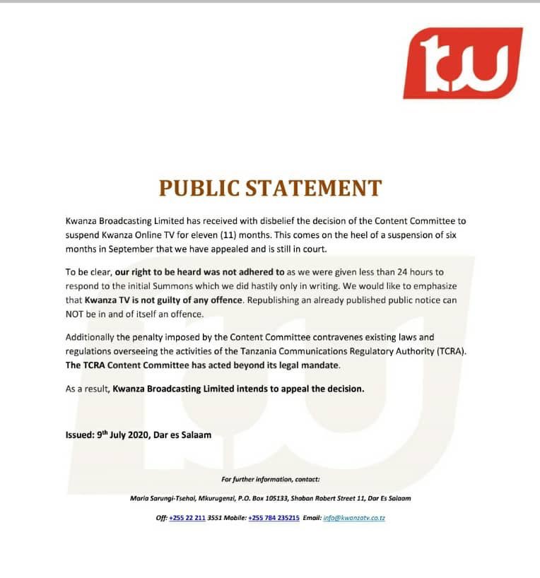 Maria hasn’t been having a jolly time either. Kwanza TV, an online television channel she owns, has been suspended for 11 months. The Tanzania Commission Regulatory Authority (TCRA) issued a letter on the 6th of July 2020 alleging that its Instagram page was unpatriotic and could negatively affect the security, unity, and economy of the country. The ‘crime’ they allegedly committed was to repost a link from the US embassy in Tanzania warning of the increase risk of COVID-19 in the country and the government not releasing aggregate numbers on cases or deaths since April 29, 2020.