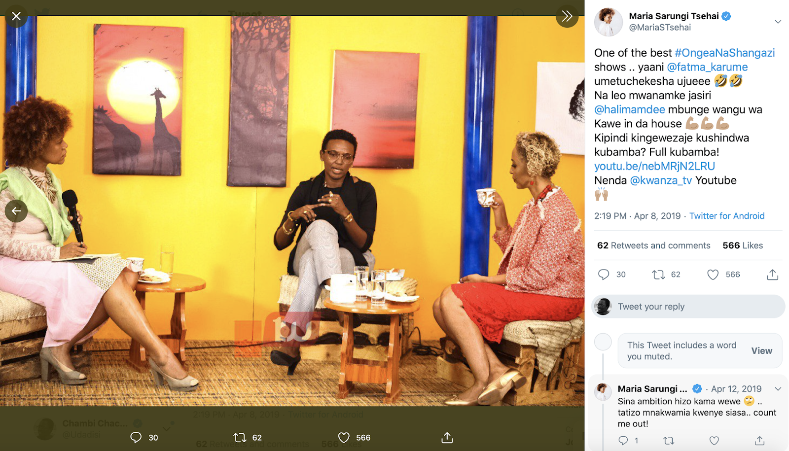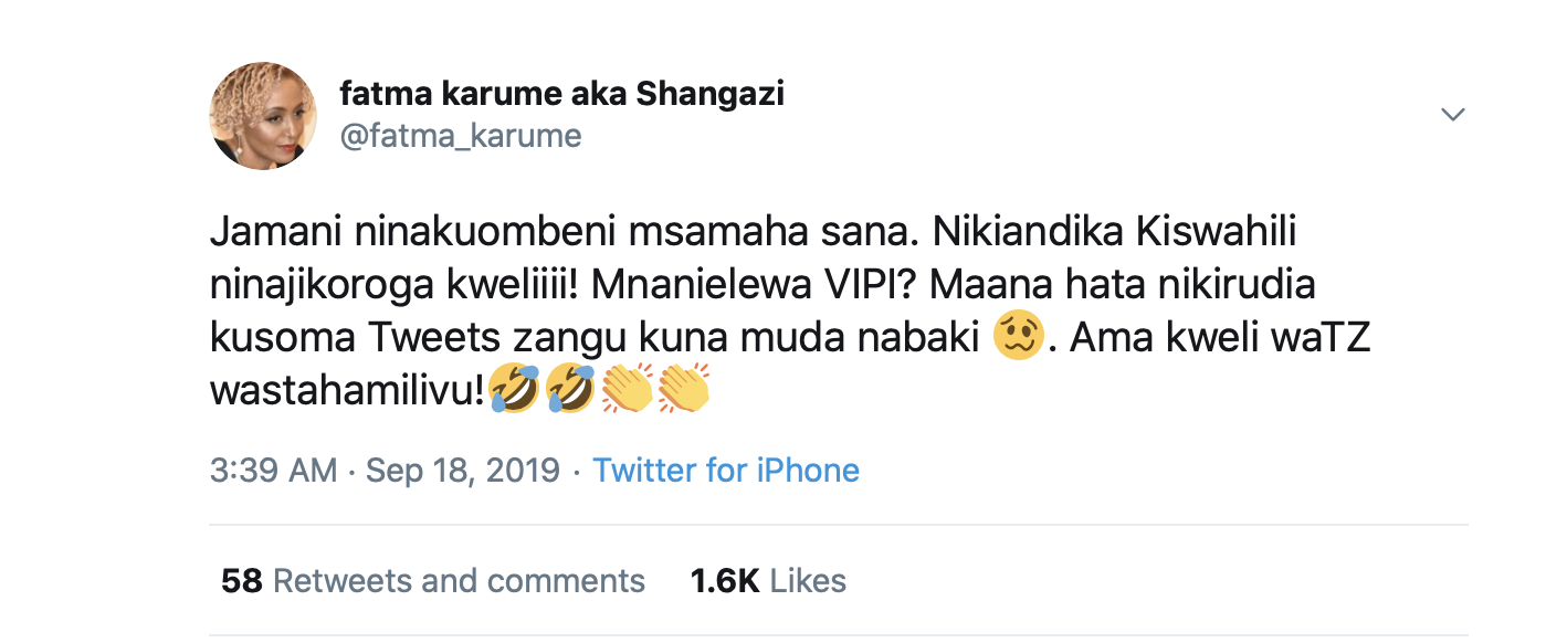 As we say in Swahili, avumaye baharini papa, kumbe wengine wapo. That is, the one who makes wave in the sea is the shark, but then there are others. So, yes, these two shangazi are making waves, but they are not the only ones. The other Shangazi that you should keep an eye on as well are Vicensia Shule @vicensiashule, Mwanahamisi Singano @MSalimu, and Aikande Kwayu @aikande.